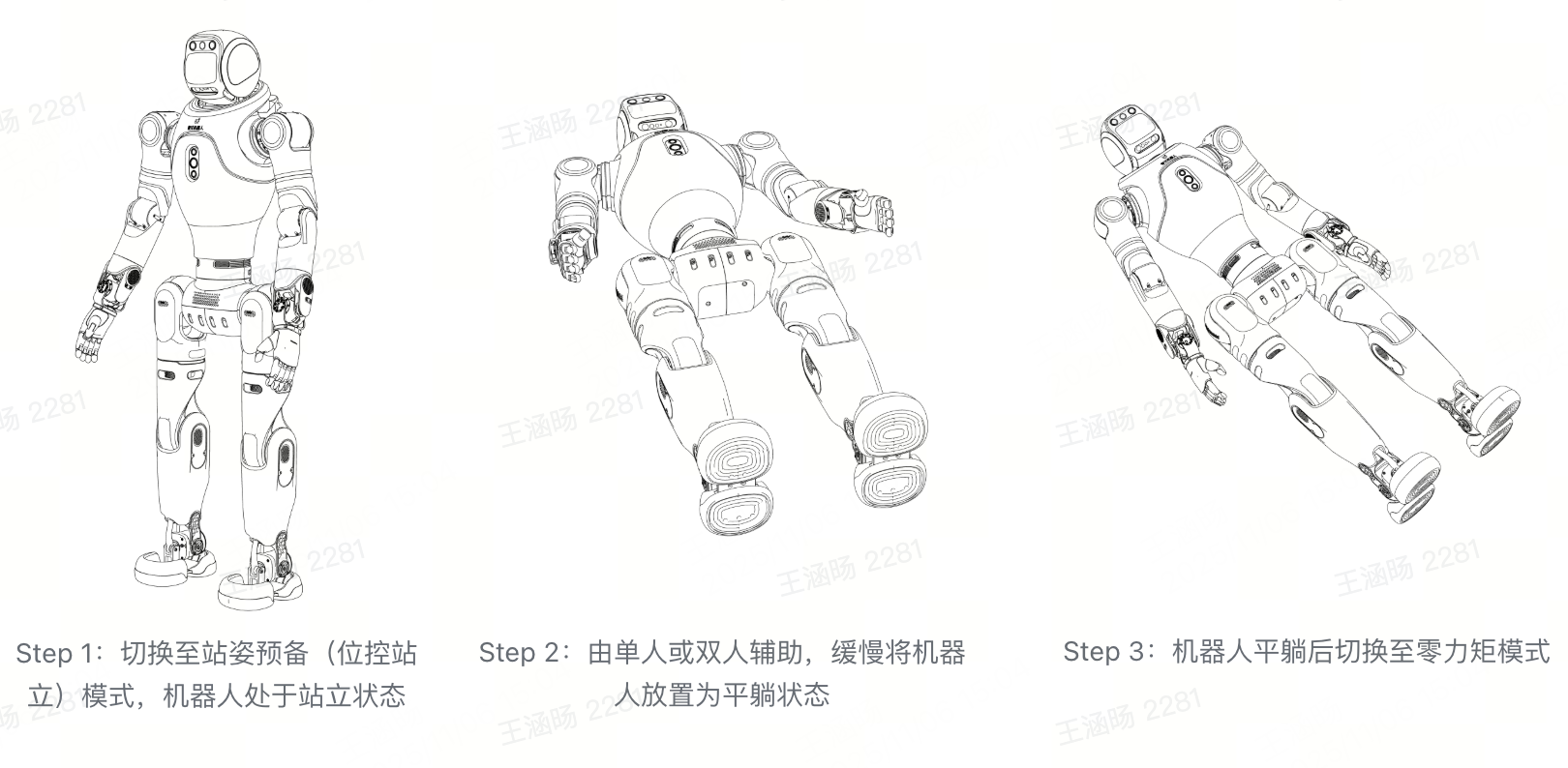 在机器人切换至站姿预备(位控站立)模式后且尚未完全平躺至地面前,请确保由单人或双人辅助支持,确保机器人平稳地并保持平衡。