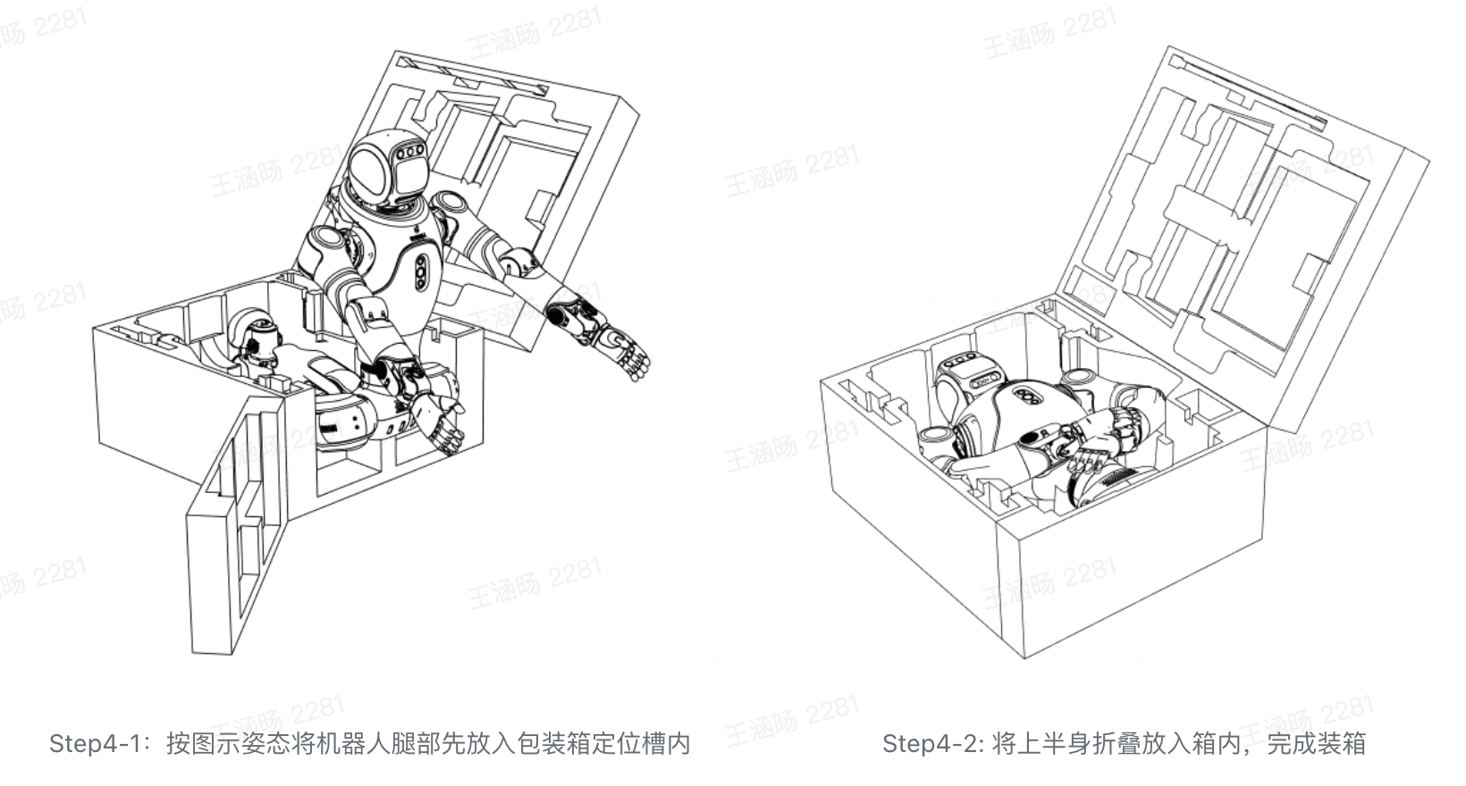 按照图示顺序,将机器人腿部先行放入定位槽内,再将上半身折叠放置至包装箱中。